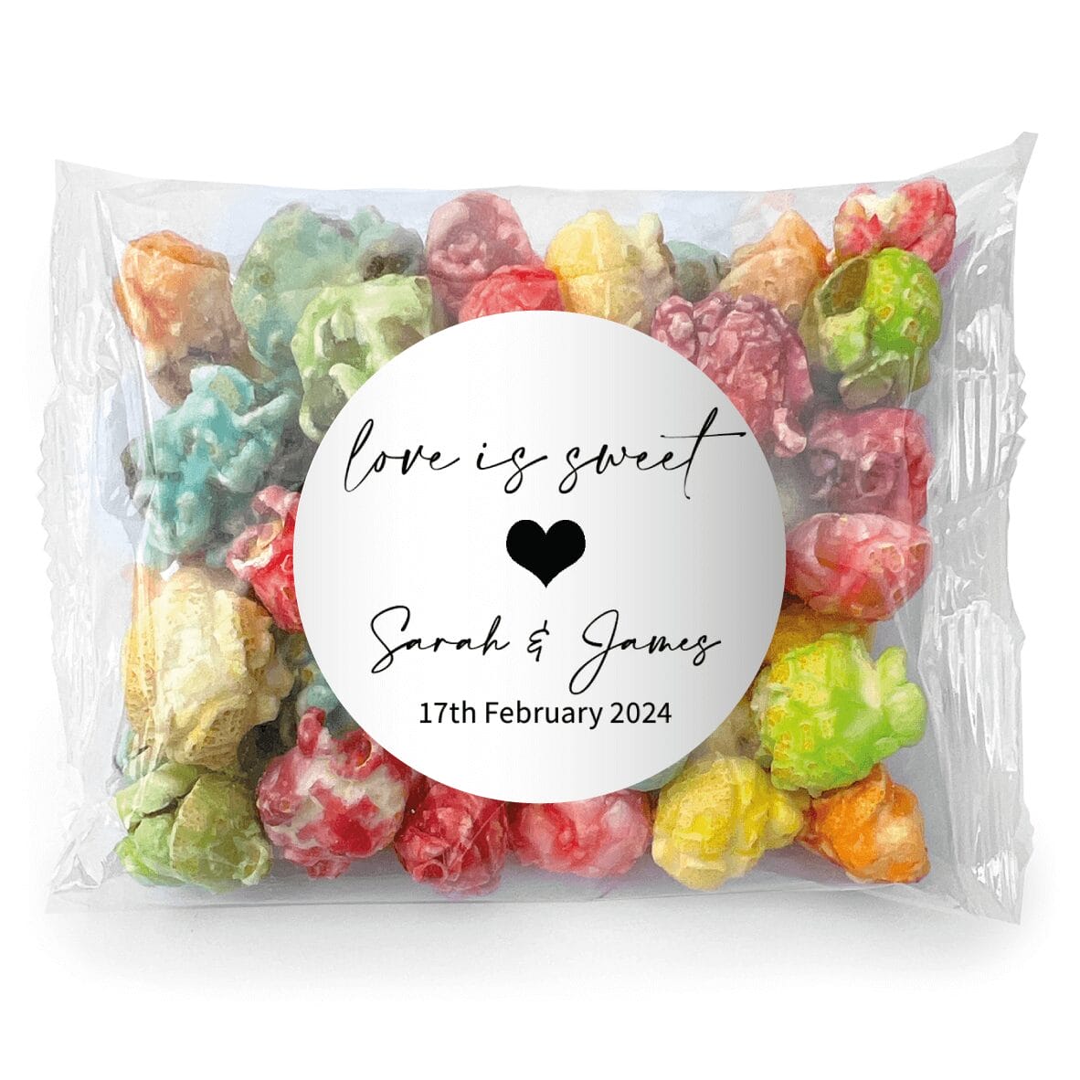 You can add any wording you like to your popcorn label design. You can also change colours at no extra cost - just leave us a note at checkout. Your artwork will be designed by a qualified graphic designer who will ensure they look absolutely perfect.
