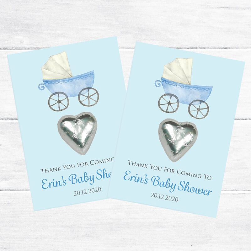 Add a splash of colour and give your guests a personalised thank you gift or favour at your next event with our Blue Pram Baby Shower Personalised Chocolate Heart Favours. They are perfect for placing on tables or plates. You can even add your guest names for use as place cards for a small additional charge.