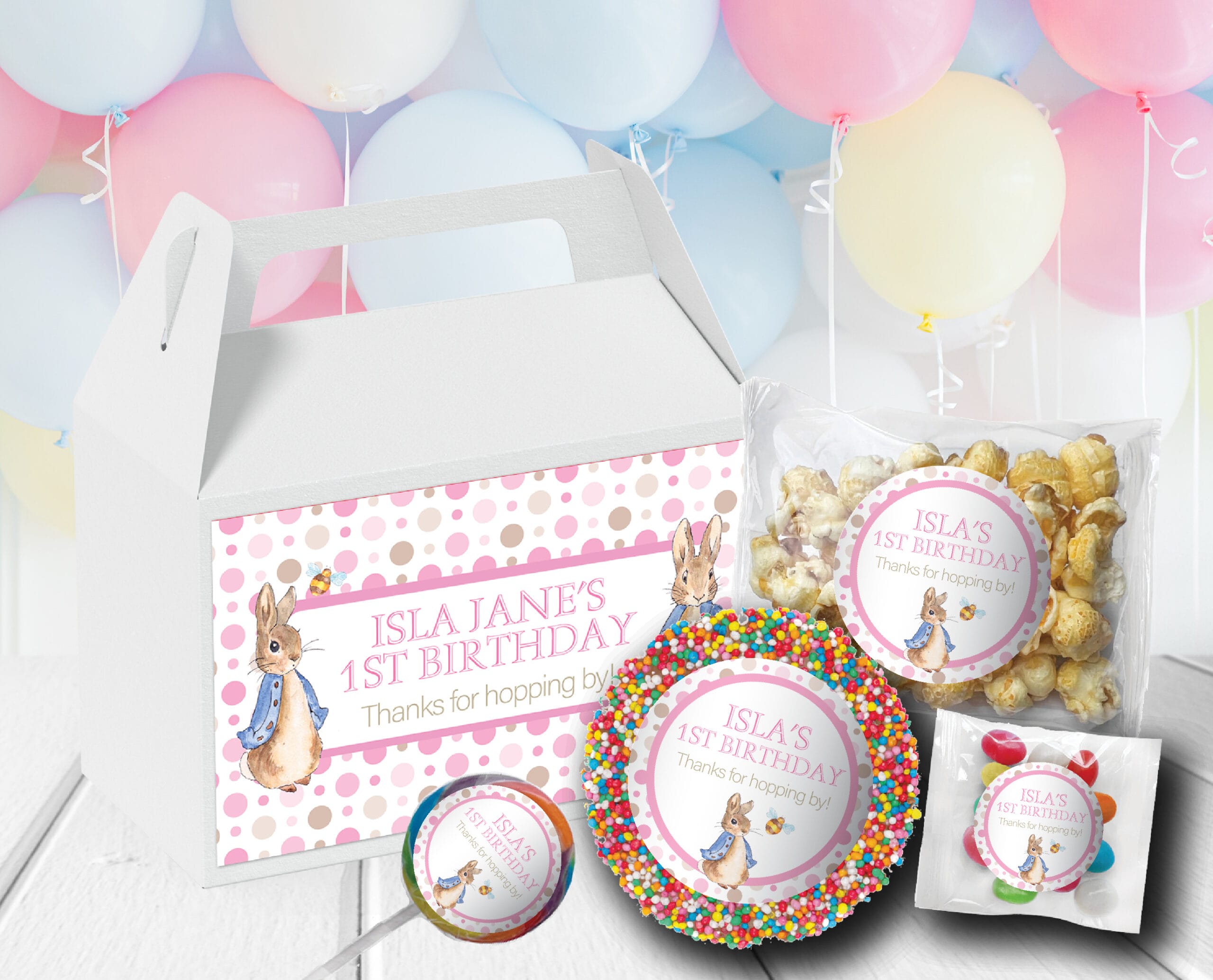 You can add any wording you like to your design - the same wording will appear on all items in the pack. Add your own matching party favours for an additional cost by selecting them from the menu. Your party boxes will be designed by a qualified graphic designer who will ensure they look absolutely perfect.