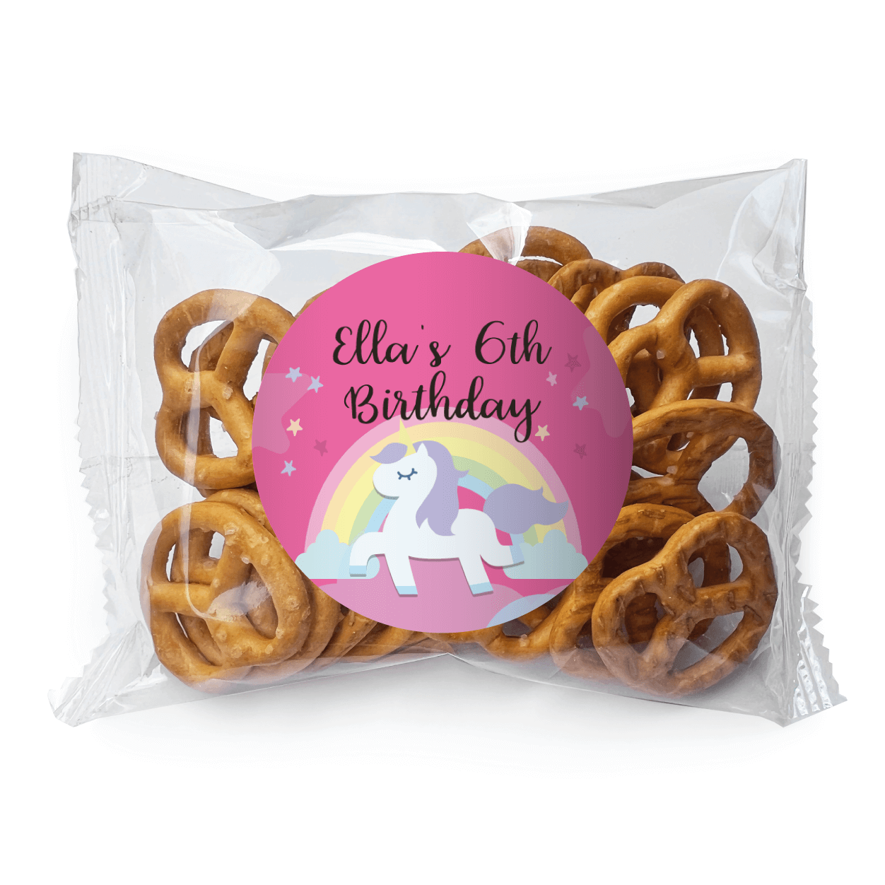- Custom labels are professionally printed on quality gloss stickers & attached to your bags of Pretzels