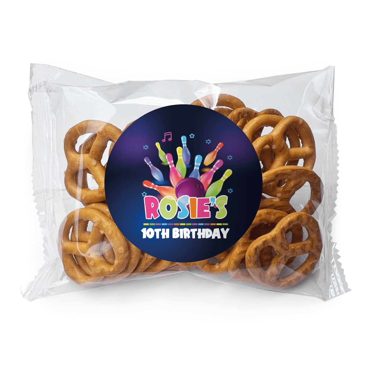- Custom labels are professionally printed on quality gloss stickers & attached to your bags of Pretzels